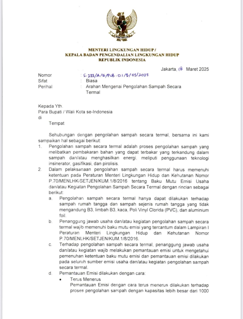 Padahal, insinerator yang sesuai regulasi justru diakui sebagai bagian dari solusi nasional untuk mengatasi darurat sampah dan mendukung target Indonesia Bebas Sampah 2029.