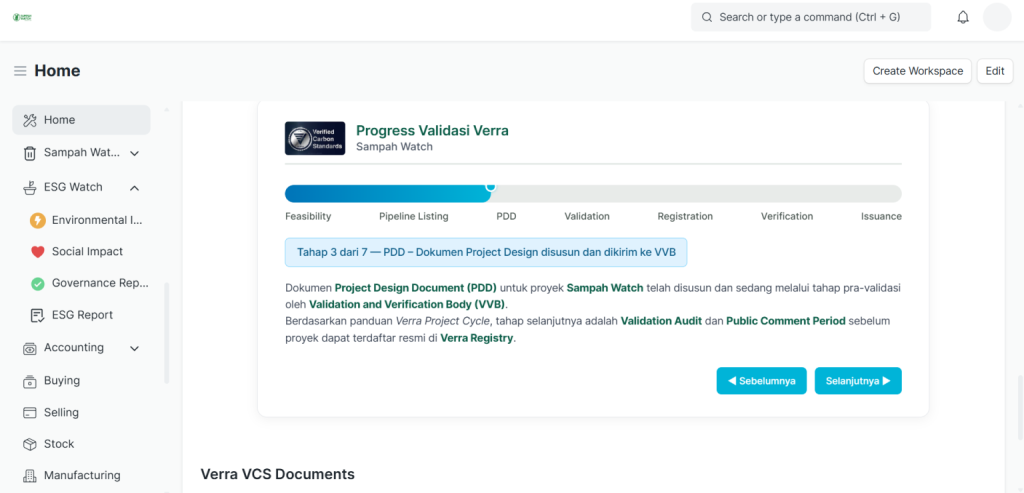 Penyusunan dokumen PDD dilakukan secara otomatis melalui sistem ERP Sampah Watch, yang secara digital menghasilkan laporan sesuai panduan resmi Verra Project Cycle. Tahap berikutnya adalah Validation Audit dan Public Comment Period, sebelum proyek Sampah Watch terdaftar secara resmi di Verra Registry.