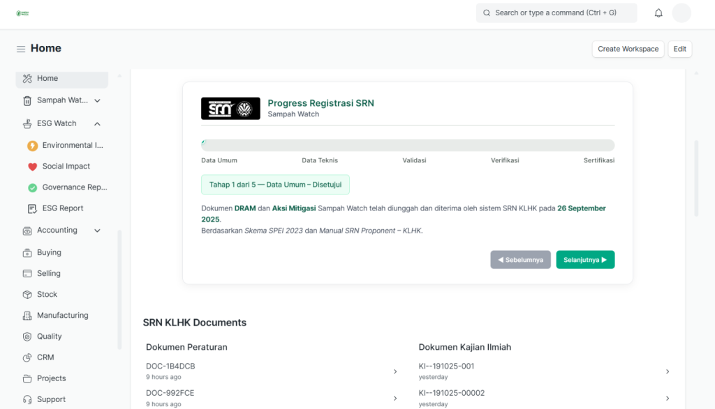 Melalui dashboard Progress Registrasi SRN, Sampah Watch telah menyelesaikan Tahap 1 dari 5, yakni Data Umum – Disetujui oleh sistem SRN KLHK. Dokumen DRAM (Dokumen Rancangan Aksi Mitigasi) dan Aksi Mitigasi Sampah Watch telah diunggah dan diterima oleh KLHK pada 26 September 2025, berdasarkan pedoman Skema SPEI 2023 dan Manual SRN Proponent – KLHK.