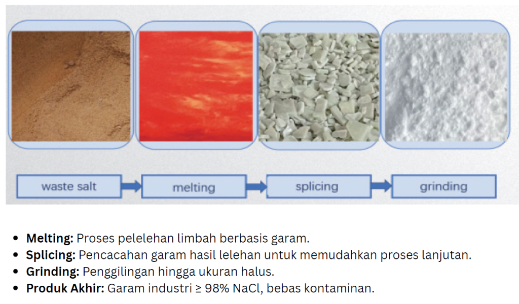 - Pemulihan Garam Murni: Limbah garam diolah menjadi garam industri yang dapat digunakan kembali (NaCl ≥ 98%).