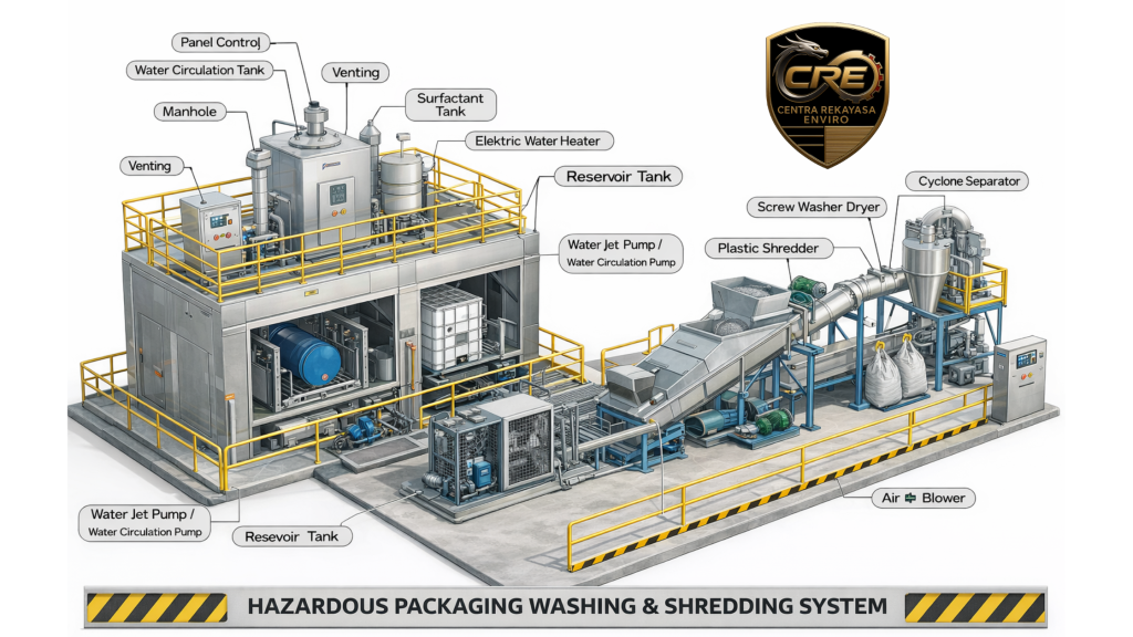 PT Centra Rekayasa Enviro (CRE) menghadirkan Integrated Hazardous Packaging Washing & Shredding System, sebuah solusi rekayasa terpadu untuk pencucian dan dekontaminasi kemasan limbah B3 yang dirancang untuk memenuhi kebutuhan industri modern akan sistem pengelolaan limbah yang aman, efisien, patuh regulasi, dan berkelanjutan.