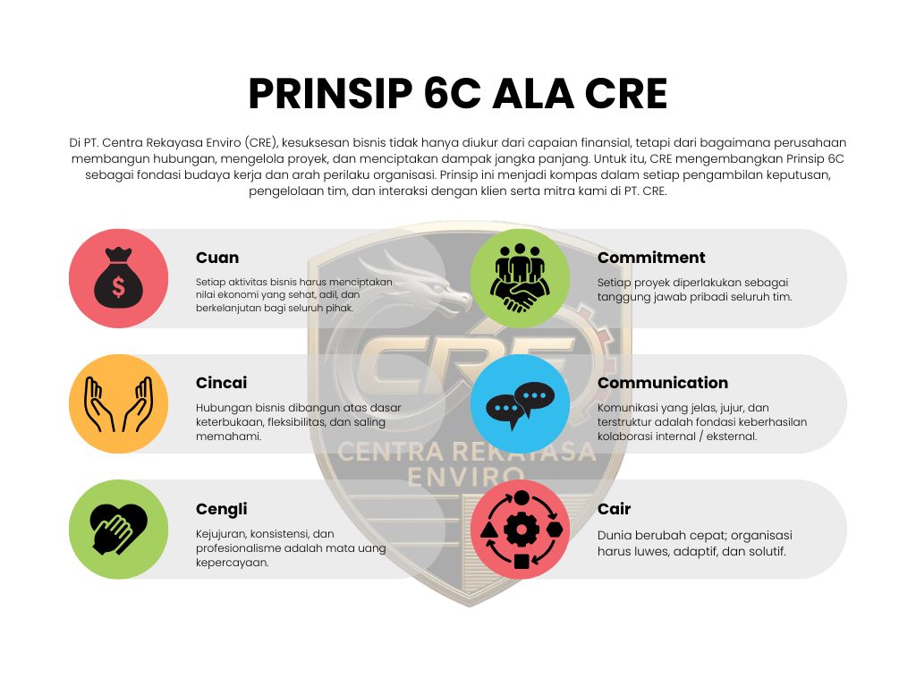 Di PT. Centra Rekayasa Enviro (CRE), cara kami bekerja bukan bersifat ad-hoc atau sekadar mengikuti tren industri. Kami bekerja berdasarkan landasan prinsip yang kuat yang kami sebut sebagai Filosofi Bisnis 6C. Prinsip ini membentuk seluruh perilaku organisasi — dari desain solusi, pengambilan keputusan, pengembangan tim, hingga hubungan dengan klien, mitra, dan masyarakat.